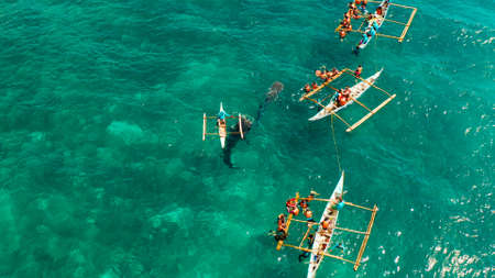 Tourists are watching whale sharks in the town of Oslob, Philippines, aerial view. Summer and travel vacation concept