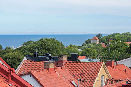 View from the lower observation deck to the houses with orange tiled roofs against the blue sky. Wanalynn area. Old Tallinn.