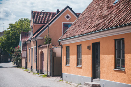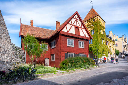 VISBY, SWEDEN - JULY 27, 2020: Summer city view of an old red wooden gothic alp building in the historical city Visby, Gotland Sweden July 27, 2020. Incidental people walking by on cobblestone street.