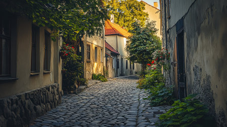 Explore a serene cobblestone alleyway lined with charming architecture and lush greenery. Sunlight filters through, creating an inviting atmosphere perfect for wanderers.