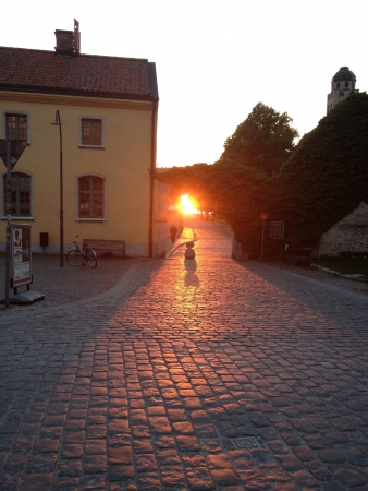 Cobblestoned street and colorful cottage houses in old town Lund Sweden during summer sunset