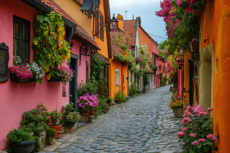 Picturesque cobblestone street with colorful flowers adorning charming pink houses