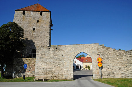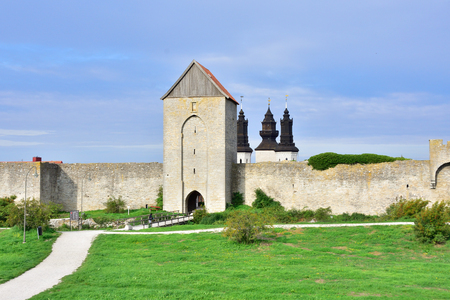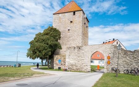 Visby, Sweden - July 8, 2016: Medieval city wall in Visby. Visby is a historic Hanse town and a major tourist destination on Swedish Baltic sea island Gotland.