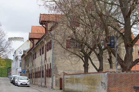 Flensburg, Germany - August 14, 2021: Oluf-Samson-Gang, a beautiful historic street in Flensburg with a view of the harbor