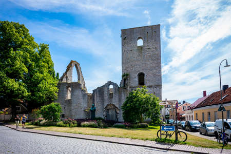 VISBY, SWEDEN - JULY 27, 2020: Beautiful summer city view of an old ancient church ruin with incidental people in the foreground in the city of Visby Gotland Sweden July 27, 2020.
