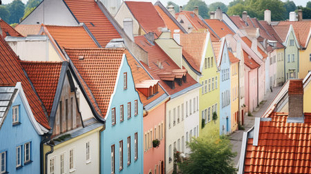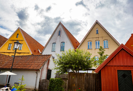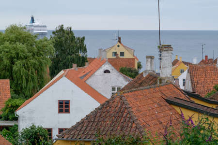 gables against the blue sea, With white chimneys and tiled roof. sampling of typical Danish or Scandinavian building traditions