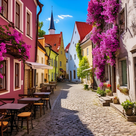 Experience the captivating allure of Tallinn, Estonia with this enchanting scene that perfectly blends old-world charm and modern innovation. Discover the harmonious combination of a cobblestone street in the Old Town adorned with vibrant flowers, as medieval castles with majestic spires serve as a breathtaking backdrop. Immerse yourself in the warm hospitality of locals dressed in traditional Estonian attire, engaging with visitors and showcasing the rich culture of the region. Marvel at the unique features like colorful street art, quaint cafes, and a bustling marketplace that add to the charm of Tallinn. This image is sure to evoke awe and fascination from viewers, capturing the essence of this enchanting city.