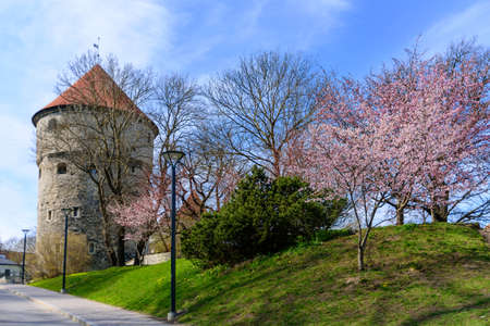 Kiek-In-De-Kok artillery tower in Tallinn, Estonia at sunny spring day with blossoming cherry trees