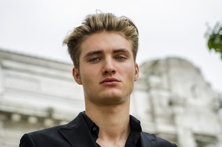 Handsome blond young man head-shot outdoors, looking at camera