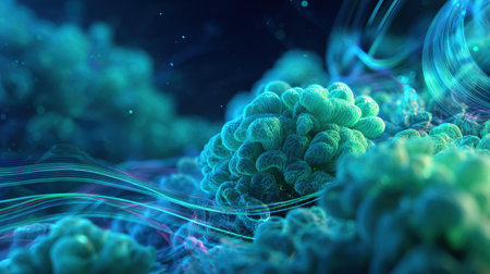 A glowing, intricate green biological form stands prominently in a blurred, futuristic laboratory setting. This abstract visualization suggests cutting-edge research, virology, cellular biology, or ge