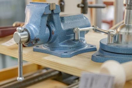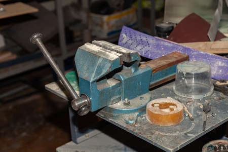 Blue vise close up. Woodwork workshop. Carpenter's workroom. Blur, selective focus.