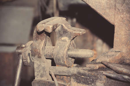 Rusty bench vise in the garage. Object photo.