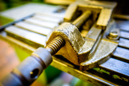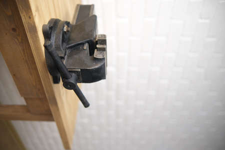 Closeup of vice tool clamping device on wooden background.