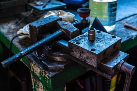 old hammer on the vise, metalworking industry