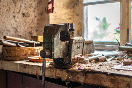 old vise on the desktop of a rural carpenter