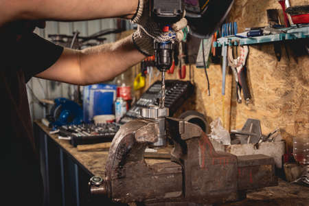 A worker in overalls works behind a workbench with metal vises. Production of metal parts at the factory. Equipment assembly.