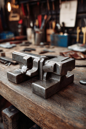 portable blue metal vises securely attached to a wooden desk, symbolizing craftsmanship, focus, and the union of strength and creativity in a workspace
