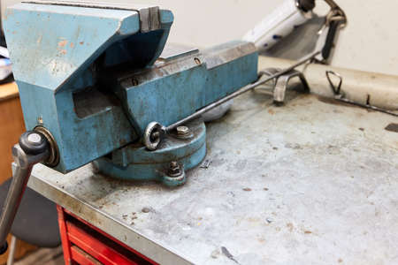 blue vice on the workbench of the mechanical workshop