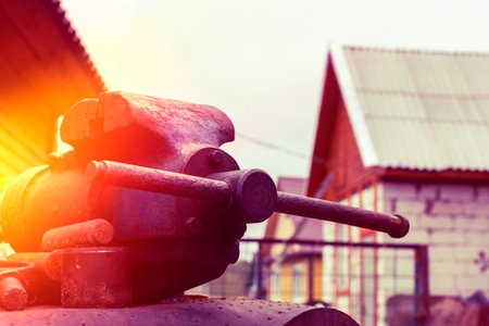 Working metal vise in a workshop by wooden buildings on a cloudy day