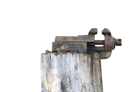old rusty vise mounted on a spruce stump isolated over white background