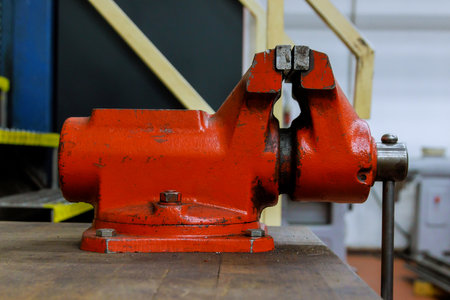 The vise is fixed on the metalworking workbench. Red vice on a wooden table. Bench tools. Side view.