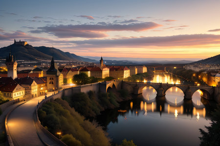 A tranquil evening view of a mountain valley city illuminated by soft lights and serene nature.