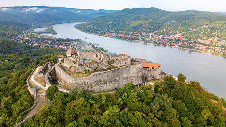 Aerial view of Visegrad castle in Hungary, next to Danube river in Danube bend