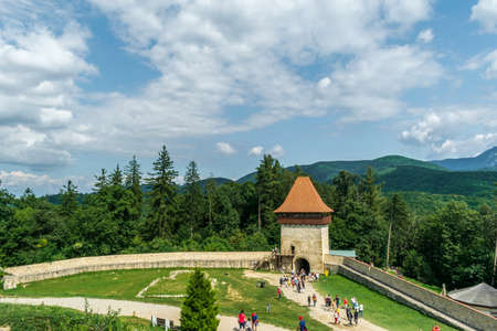 Rasnov Fortress with beautiful medieval stone Watchtower under cloudy sky, Rasnov city, Brasov county, Romania. Summer landscape with walking tourists