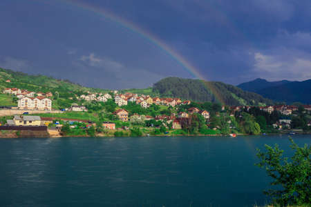 Panoramic View in the Rainy Day to the Višegrad with the Rainbow over the Drina River, Bosnia and Herzegovina