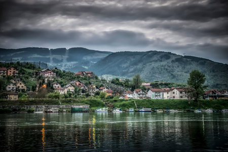 A small coastal town with houses and buildings, located by a calm river, surrounded by wooded hills and mountains under a clear sky at sunset. Visegrad, Bosnia and Herzegovina.