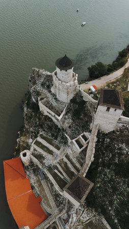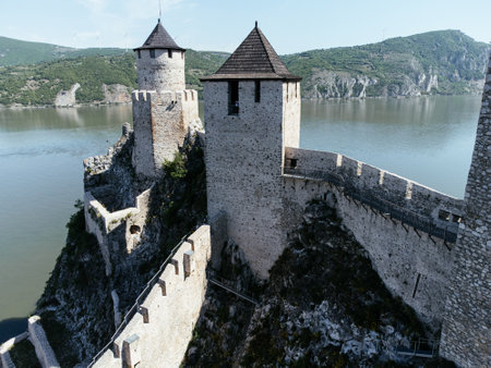 Aerial view of Golubac Fortress on rocky cliff above the Danube River in Serbia, surrounded by water and medieval towers. The most popular and beautiful fortress in Serbia on the border with Romania