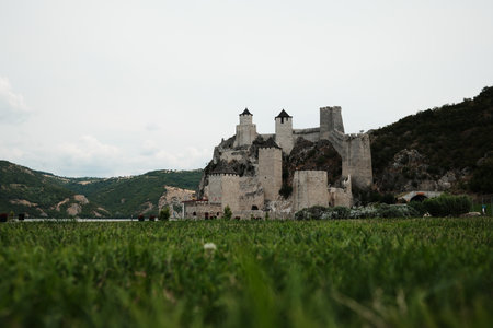 Scenic view of Golubac Fortress surrounded by green hills and dramatic sky, located on the banks of the Danube River in Serbia