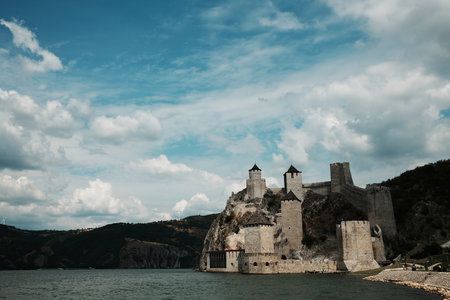Panoramic view of Golubac Fortress on the Danube River under a blue sky with clouds. Travel in Serbia concept