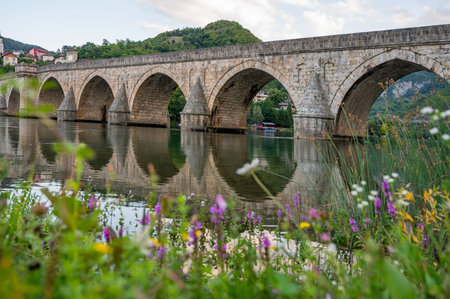 An ancient stone bridge with arches spanning the tranquil Drina River with wild flowers in the foreground and lush green hills and houses in the background. Heritage and developing tourism concept. Visegrad, Bosnia and Herzegovina.