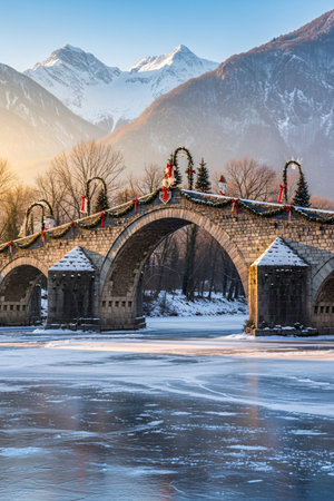 Historic stone bridge adorned with Christmas garlands, red bows, and festive lights over a frozen river, surrounded by snowy Alpine mountains during winter season