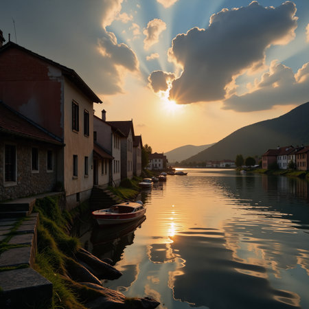 An old village illuminated by golden sunlight alongside a flowing river at twilight