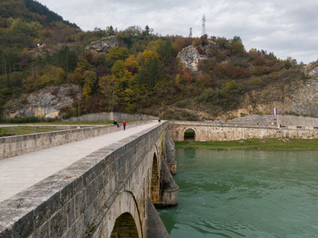 An old stone bridge with arches spans the tranquil Drina River, surrounded by green hills and a charming European town under a clear blue sky. Top view. Visegrad, Bosnia and Herzegovina.