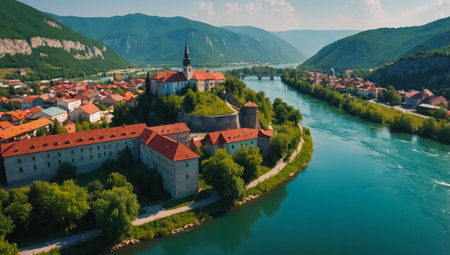 A small coastal town with houses and buildings, located by a calm river, surrounded by wooded hills and mountains under a clear sky at sunset. Top view. Visegrad, Bosnia and Herzegovina.