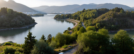 A breathtaking view of a calm river reflecting lush green hills and a blue sky, creating a peaceful atmosphere ideal for nature lovers and photographers.