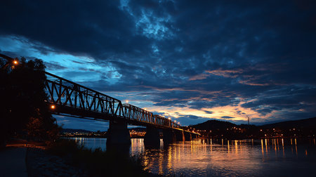 Metal truss bridge spanning a calm river with stunning reflections and warm sunset colors