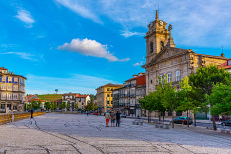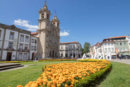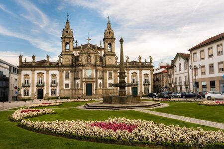 GUIMARAES, PORTUGAL, MAY 23, 2019: View of church of San Pedro at lago do toural in Guimaraes, Portugal