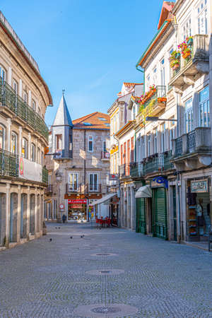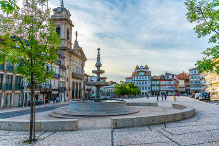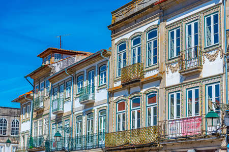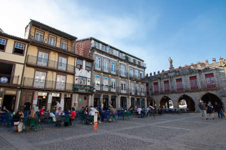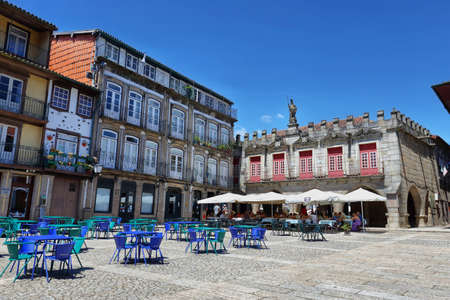 Guimaraes, Portugal - August 3, 2020: Colorful square in Guimaraes dowstown city, Portugal