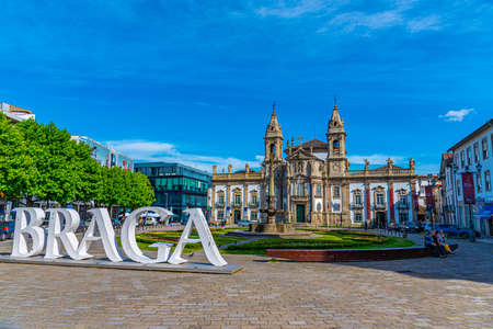 BRAGA, PORTUGAL, MAY 23, 2019: Braga sign and church of Sao Marcos in Braga, Portugal