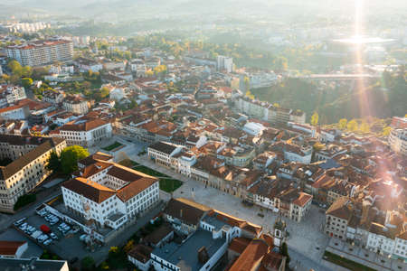 Aerial top view of old historic town Viseu with church and Cathedral, Portugal