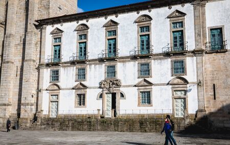 Braga, Portugal - October 25, 2021: Street atmosphere and architectural detail in the historic city center on an autumn day