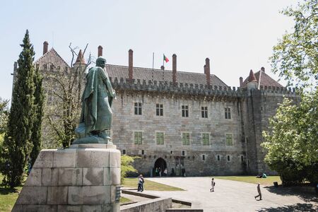 Guimaraes, Portugal - May 10, 2018: architectural detail of the Palace of the Dukes of Braganza next to the castle of Guimaraes that tourists visit on a spring day.