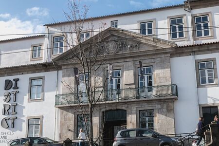 Porto, Portugal - November 30, 2018: Storefront and architectural detail of District - Offices and Lifestyle, a co working space in the historic city center on a winter day