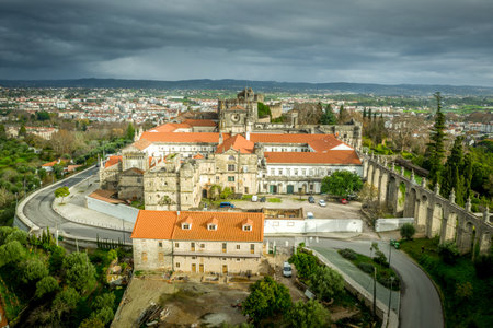 Aerial panoramic view of Tomar castle and convent on a winter afternoon in Portugal