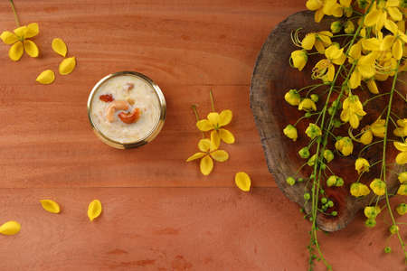 Vermecelli Payasam or Kheer ,South Indian main sweet dish made using vermicelli ,milk,sugar and dry nuts and beautifully arranged in a brass vessel with golden shower flower in the wooden background.