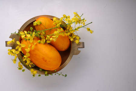 Golden shower flower and yellow cucumberarranged in a brass traditional vessel or urule placed on thewhite textured background.